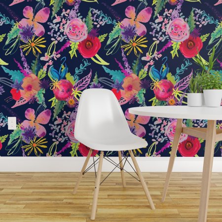 Peel And Stick Removable Wallpaper Floral On Navy Watercolor